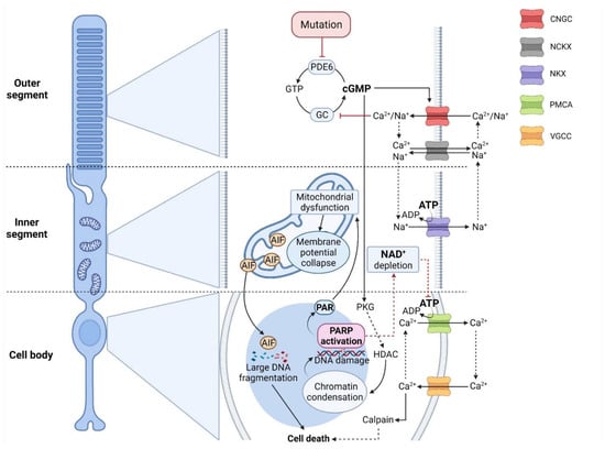 While over the last 2–3 decades, research has overwhelmingly focused on apoptosis as a causative mechanism for RD, recent evidence indicates that apoptosis only plays a minor role in photoreceptor degeneration [9,10,11,12]. Instead, the importance of non-apoptotic mechanisms, for instance, triggered by exceedingly high levels of cyclic-guanosine-mono-phosphate (cGMP), is increasingly recognized [13]. Hence, for the purposes of this review, we will mention apoptosis only briefly to then focus on non-apoptotic cell death mechanisms. This will include cGMP-dependent cell death [13] and PARthanatos [14] as well as enzymes involved in either or both degenerative pathways. Finally, an outlook is given into how future therapeutic approaches may use an improved mechanistic understanding of PARthanatos and cGMP-signaling.
