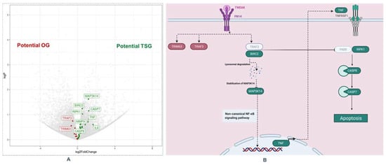 TNF-like weak inducer of apoptosis (TWEAK) Pathway in thick melanoma. (A): Volcano Plot for differentially gene expression: red boxes are genes with higher expression in thick M+ (left), and green boxes are genes with higher expression in thick M− (right). (B): Apoptosis module of the TWEAK pathway (Created with Biorender): Genes overexpressed in thick M− (green) and genes overexpressed in thick M+ (red), TWEAK/Fn14 interaction may trigger the degradation of cIAPs and then enhances apoptotic processes through TNFR1 [11,12,13]. This figure was adapted from Bhattacharjee et al. Abbreviations: OG: oncogene; TSG: tumor suppressor gene.