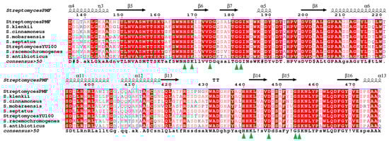 Multiple amino acid sequence alignment of SkPLD conserved region with several other Streptomyces PLDs. Secondary structures of PLDs were shown above the alignments. Residues highlighted in red background were indentical among the protein compared. Residues in the conserved HxKxxxxDxxxxxxGG/S (HKD) motifs of the PLD superfamily were indicated with green triangles. Arrow stands for β-strand, helical curve denotes α-helix.