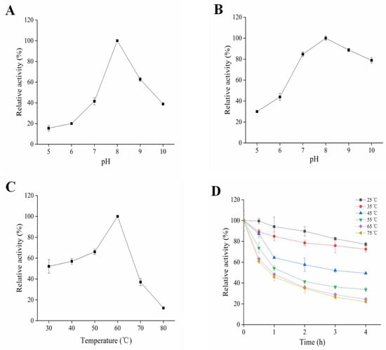 Effects of pH and temperature on the hydrolytic activity of SkPLD. (A) The enzymatic activity of SkPLD was measured under various pH buffers. The enzymatic activity value obtained at pH 8.0 was taken as 100%. (B) pH stability of SkPLD. The residual activity of SkPLD was determined after treating for 2 h under various pH buffers. The residual activity value obtained at pH 8.0 was taken as 100%. (C) The enzymatic activity of SkPLD was measured at various temperatures. The enzymatic activity value obtained at 60 °C was taken as 100%. (D) Thermostability of SkPLD. The residual activity was determined after treating for 4 h at different temperatures. Values were means ± standard deviation from three independent experiments.