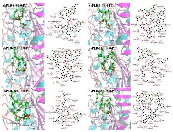 3D (left) and 2D (right) structure of complexes of SkPLD and 6:0/6:0-PC, 8:0/8:0-PC, 12:0/12:0-PC, 14:0/14:0-PC, 16:0/16:0-PC and 18:0/18:0-PC. In the 2D diagram, hydrogen-bond interactions and hydrophobic contacts were shown as green and red dotted lines, respectively.