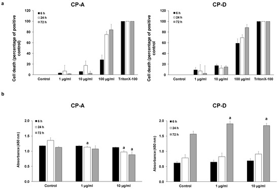 To examine the effect of CSE on cell proliferation, first we determined the concentrations of CSE at which the cells retained their viability. CSE concentrations were chosen based on the literature data [19,20]. Cytotoxicity studies showed that both CP-A and CP-D cells mostly tolerated CSE at 1 and 10 µg/mL concentrations, at each incubation time (6, 24 and 72 h). In contrast, 100 µg/mL CSE induced a high degree of cell death, especially during longer incubation (Figure 1a). Therefore, in the proliferation assays, the effect of 1 and 10 µg/mL CSE was examined for 6, 24 and 72 h (Figure 1b). In the metaplastic, CP-A cells, CSE treatment dose-dependently reduced cell proliferation in the 24 and 72 h treatment groups. In contrast, in the dysplastic, CP-D cells 72 h CSE treatment significantly increased the proliferation.