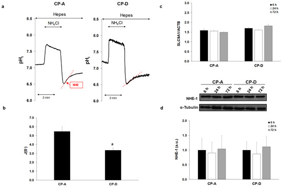 Activity, mRNA and protein expression of Na+/H+ exchanger-1 (NHE-1) in esophageal cell lines. (a) Representative intracellular pH (pHi) curves present the recovery from acidosis in CP-A and CP-D cells. (b) Summary data of the calculated activity of NHE-1 in the different cell lines. The rate of pH recovery (J(B−)) was calculated from the ΔpH/Δt obtained via linear regression analysis of the pHi measurement performed over the first 60 s of recovery from the lowest pHi level (initial pHi). The buffering capacity at the initial pHi was used to calculate J(B−). Data are presented as the mean ± SEM. a: p ≤ 0.05 vs. CP-A; n = 5–11 exp./26–91 region of interests (ROIs). (c) mRNA and (d) protein expression of NHE-1 in the CP-A and CP-D cells. α-Tubulin was used as a protein-loading control. Data represent mean ± SEM of three independent experiments.