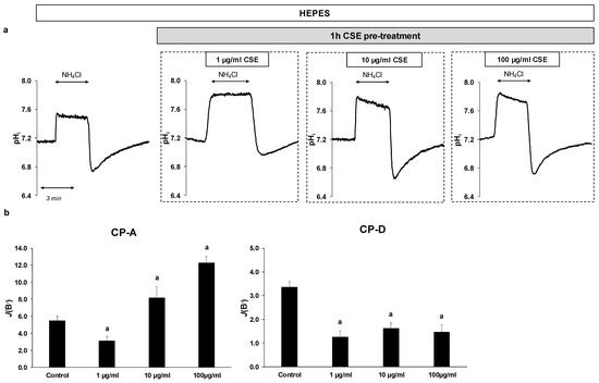 In order to investigate the effect of CSE on the activity of NHE-1, the previously mentioned NH4Cl pre-pulse technique was used. Since CSE alone can affect the fluorescence signals, cells were pretreated with 1, 10 or 100 µg/mL CSE for 1 h, and then NHE activity was measured (Figure 3a,b). Control cells were incubated in HEPES solution without CSE. In the case of CP-A cells, pretreatment with 1 µg/mL CSE decreased NHE activity from 5.47 ± 0.52 to 3.08 ± 0.55. In contrast, at higher concentrations (10 and 100 µg/mL, respectively) the activity of the exchanger increased (8.18 ± 1.3 at 10 µg/mL CSE and 12.28 ± 0.73 at 100 µg/mL CSE). In CP-D cells, CSE strongly reduced NHE-1 activity at all three concentrations (from 3.36 ± 0.24 to 1.25 ± 0.26 at 1 µg/mL CSE, 1.62 ± 0.23 at 10 µg/mL CSE and 1.46 ± 0.29 at 100 µg/mL CSE, respectively).