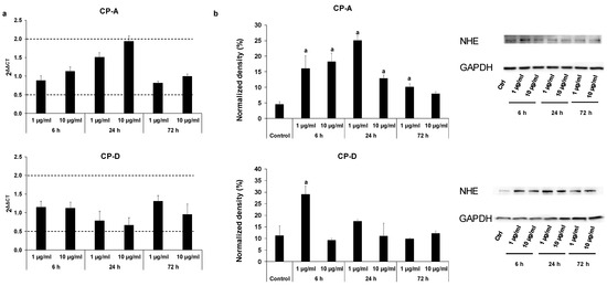 The CSE treatment did not cause significant differences in mRNA expression of NHE-1 in any of the cell lines (Figure 4a). In contrast, the protein expression was increased in the CP-A cells upon CSE treatment, almost in all treated groups (Figure 4b). In the CP-D cells, CSE treatment caused a robust increase at 1 µg/mL concentration in the 6 h treatment group, while no significant change was detected in the other groups.
