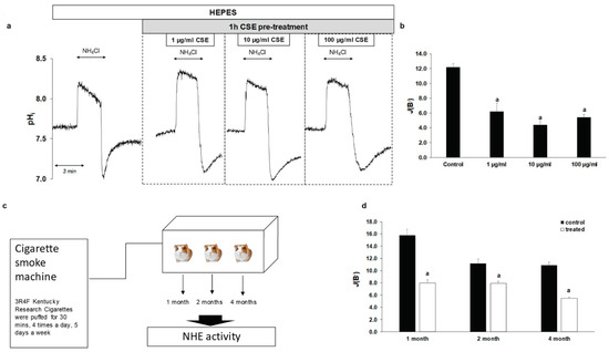 In order to investigate how CSE affects NHE activity under physiological conditions, we studied the effect of CSE on normal EECs isolated from guinea pigs. The same concentrations were used as for the cell lines, and the cells were pretreated with CSE in the same manner. As shown in Figure 5a,b, NHE activity was significantly reduced by CSE treatment (from 12.19 ± 0.46 to 4.64 ± 0.94 at 1 µg/mL CSE, to 3.96 ± 0.43 at 10 µg/mL CSE and to 4.49 ± 0.4 at 100 µg/mL CSE, respectively). In order to investigate the chronic effects of smoking, guinea pigs were exposed to cigarette smoke for one, two and four months, respectively, and then NHE activity was examined (Figure 5c). Guinea pigs of the same age were used as controls. Similar to acute CSE treatment, chronic treatment decreased NHE activity from 15.81 ± 0.91 to 7.98 ± 0.52 in the 1-month group, from 9.92 ± 0.78 to 7.9 ± 0.33 in the 2-month group and from 10.86 ± 0.54 to 5.46 ± 0.19 in the 4-month group (Figure 5d). These data indicate that smoking decreases the activity of NHE-1 in the normal eso-phageal mucosa.