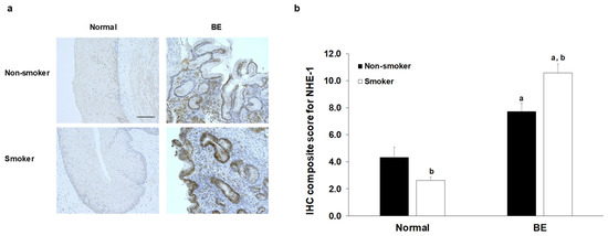 Protein expression of NHE-1 was investigated in normal squamous epithelium and in BE samples obtained from patients with smoking and non-smoking history (Figure 6a,b). Patients who had never smoked or not smoked for more than a year were classified as non-smokers, while patients who had been smokers for at least 20 years were classified as smokers. Only patients with known smoking status were included in the analysis. As controls, normal esophageal biopsy samples and the intact tumor-free margin of surgically resected esophageal cancer were used. Weak NHE-1 expression was detected in the normal esophageal epithelium, and it was further reduced by smoking. In BE, strong NHE-1 expression was observed, mainly at the basolateral membrane of the columnar cells. In smokers, NHE-1 expression increased, and staining was detected not only in the plasma membrane but in the cytoplasm as well. Interestingly, strong NHE-1 staining was also observed in the glands. There was no significant difference between the intestinal and non-intestinal metaplasia, neither in the smoker nor in the non-smoker group.