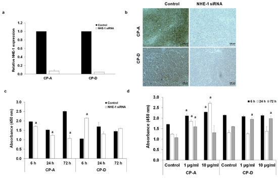 Knockdown of Na+/H+ exchanger-1 (NHE-1) in human esophageal cell lines. The expression levels of NHE-1 were investigated by RT-PCR (a) and immunohistochemistry (b) in control cells and in cells treated with specific siRNA for SLC9A1. The rate of proliferation was determined in the non-treated (c) and cigarette smoke extract-treated (d) CP-A and CP-D cells. Data represent mean ± SEM of three independent experiments; a = p ≤ 0.05 vs. control.