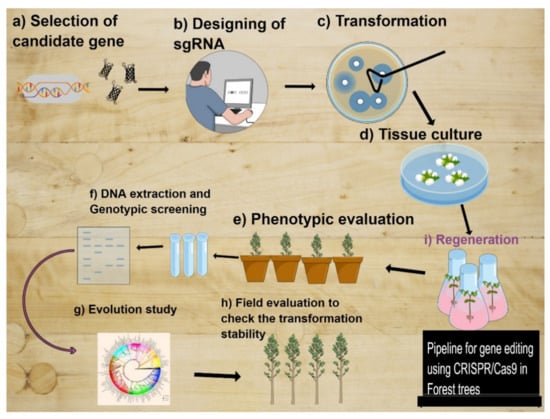 This method enables editing single to many genes by knock-in or knock-out genes from the host genome. Thus, various traits may be introduced or metabolic pathways modified concurrently by inserting double-stranded breaks (DSBs) at multiple locations [251,252,253]. The other most important aspect about the use of site-directed mutagenesis in plants is that it is relatively inexpensive, effective and easy to apply compared to other techniques [246,254]. CRISPR was also successfully used by targeting potential development and biosynthesis pathway genes in grapes as well as in the tropical tree Parasponia andersonii Planch [255,256]. Although CRISPR/Cas9 applications are expected to begin with economically significant agricultural plants, the growing number of undescribed species whose whole genomes are being sequenced will enable the technique to be used more widely throughout the plant kingdom. The pipeline to adapt the CRISPR in forest tree is given in Figure 1.