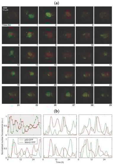 Examples of sustained oscillations in MCF7 cell following -irradiation obtained by time-lapse fluorescence microscopy, []. In (b), normalised fluorescence levels of p53 and Mdm2 from six different cells are shown, the top left plot in (b) shows oscillations in (a). Copyright (2006) reproduced with permission from John Wiley and Sons.