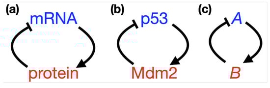 Schematics showing simple negative feedback loops between (a) Hes1 mRNA and protein, (b) p53 and Mdm2 and (c) A and B.