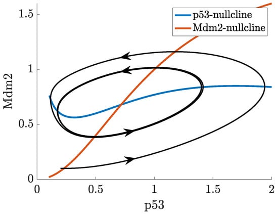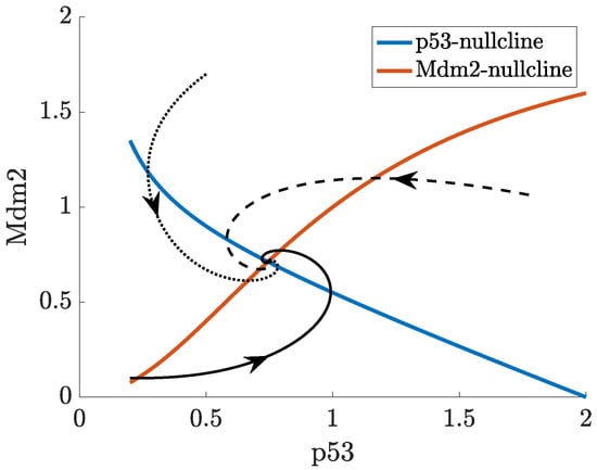 In (1), p53 is produced at a constant rate, , and degraded either in an Mdm2-dependent manner (modelled by a Michaelis-Menten function), or independently of Mdm2 with the rate of degradation, . Mdm2 is produced at a rate which depends on the concentration of p53 (modelled by a Hill function with coefficient n) and degraded at a rate . All solution trajectories of (1), regardless of initial conditions, converge eventually to a single positive steady state (fixed point), which is determined by the model parameters (given in Appendix A) and located where the curves intersect (these curves are called the nullclines of the system). Figure 4 shows a single trajectory from an initial state, , towards the stable state . The Mdm2-p53 phase plane in Figure 5 displays the dynamics of (1) from a different perspective. In this plot, the nullclines (expressed as functions, ) intersect at one point towards which all trajectories of the system tend. Three such trajectories from non-trivial initial states are shown in black; the solid trajectory curve corresponding to the solution in Figure 4. We refer to the book of Hirsch, Smale and Devaney [] for a suitable introduction into dynamical systems such as system (1) and global nonlinear techniques, for example, using nullclines to analyse such systems.