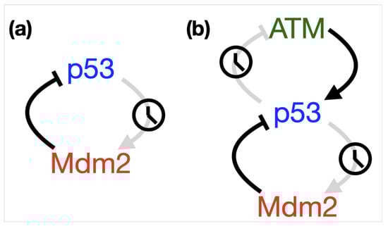 Lahav and coworkers have a long history of investigating the p53-Mdm2 pathway dynamics; providing an interdisciplinary approach by performing both experiments as well as analysis of mathematical models. Geva-Zatorsky et al. considered several different network models spanning from the basic negative feedback loop model, to models including positive feedback (see Section 2.3) or a time delay. They were the first to introduce what they called a checkpoint inhibitor model which consisted of two coupled negative feedback loops; the simple p53-Mdm2 delayed negative feedback loop coupled to a longer negative feedback loop in which a protein downstream of p53 inhibits an upstream signalling protein for p53. Although they didn’t specify the specific proteins which formed the second negative feedback loop, this network motif was found to be particular robust to generating sustained oscillations for a wide range of parameters []. Batchelor et al. specifically looked for protein candidates which fit this check point inhibitor model, and by using mathematical modelling in synergy with experiments were able to suggest that good candidates for these additional proteins are ATM (ataxia telangiectasia mutated serine/threonine kinase) and Wip1 (wild-type p53-induced phosphatase 1) []. ATM, triggered by DNA damage, phosphorylates and activates p53, while it is concurrently downregulated by Wip1 an additional target protein for the transcription factor p53. Purvis et al. used such a model to investigate the role p53 dynamics (pulsed or sustained expression) has on cell fate, and whether drug treatments could alter the dynamics and hence the outcome for the cell []. In Figure 6b we indicate how the negative p53-Mdm2 feedback loop is coupled to a negative feedback loop between p53 and ATM. In this case the delay (clock symbol) on the negative arm of the loop, accounts for the time taken for p53 to transcribe Wip1 and Wip1 to downregulate ATM; Wip1 being modelled either implicitly or explicitly depending on the model. In recent years, a common extension when investigating the role of delays is to consider the extended model given in Figure 6b. It has been shown that the delays in both negative feedback loops are important components to derive oscillatory behaviour [,]. One difficulty though is that in order to make analysis of the models tractable it has, so far, required that both delays are assumed to be equal, which may or may not be the case in the real biological system.