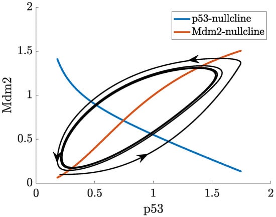 In (2), the actual concentration of Mdm2, which regulates p53 at the time t is taken as the concentration of Mdm2 at the time . In this case, oscillations in the concentration of p53 and Mdm2 may appear for a sufficiently long delay, as can be seen in Figure 7. While the nullclines of the DDE system (2) do not differ from the nullclines of (1), the trajectory from Figure 7 settles into a sustained oscillatory path, called a limit cycle, shown in the phase-plane in Figure 8. Depending on the initial state, some solutions to (2) may show oscillations with varying amplitudes and period before they finally approach the limit cycle, this is shown in the vector field plot given in Figure A1b in Appendix A.