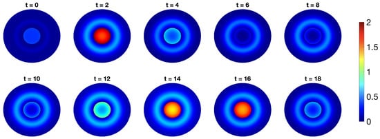 In (3), Mdm2-dependent degradation of p53 happens in both the nucleus and cytoplasm. The p53-dependent synthesis of Mdm2 is now a two-step process: first Mdm2 mRNA is produced in the nucleus (modelled by a Hill function), and then mRNA is translated into Mdm2 in the cytoplasm, with a rate of translation . p53 is produced in the cytoplasm, at a constant rate . Natural degradation is denoted by , and . All three species are assumed to diffuse freely and randomly in the cell (modelled by a Laplacian ), with the diffusion rates denoted by , and . In the simulation below, it is assumed that mRNA can shuttle from the nucleus to the cytoplasm, whereas p53 and Mdm2 proteins migrate from the cytoplasm to the nucleus only. Transport through the nuclear membrane is assumed to be passive and given by a single parameter called membrane permeability. Oscillatory solution trajectories are confirmed in both the dynamic plot in Figure 10, and by the presence of a limit cycle in the phase-plane in Figure 11. Furthermore, oscillations of p53 can be seen the 2D spatio-temporal plots, depicted in Figure 12. Parameters are provided in Appendix A. Unlike in Equations (1) and (2), the time derivative is denoted by in (3), the commonly used notation in PDEs.