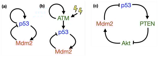 Schematics showing positive feedback loops involving p53-Mdm2: the simple negative feedback between p53 and Mdm2 is coupled to (a) a positive undetermined feedback on p53 or (b) a positive feedback loop of autocatalytic ATM. Panel (c): a positive feedback loop of p53-PTEN-Akt-Mdm2 which contains two inhibitory arms which combine to make this pathway “globally” positive.