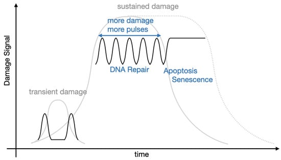 The mathematical model proposed by Alon and coauthors has only a few components but it is complicated in the sense that many different relationships are taken into consideration. Moreover, a necessary time lag between p53 activation and p53-dependent induction of Mdm2 is incorporated in the form of a hypothetical intermediary []. Nevertheless, the feedback from modelling flagged new experimental questions. Galit Lahav, at that time a postdoc in the group of Uri Alon and currently the chair of the Department of Systems Biology at Harvard Medical School, tried to visualise these damped oscillations of p53 and Mdm2 in individual living cells ([], p. 100). Lahav and collaborators were the first ones to develop stable cell lines (specifically, MCF7 breast cancer cells), with the genes for p53 and Mdm2 fused respectively to cyan and yellow fluorescent proteins. The cells were exposed to -radiation and p53 and Mdm2 were visualised in glorious technicolor for the first time at the single cell level using time-lapse fluorescence microscopy. However, rather than damped oscillations, p53 was observed to oscillate sustainedly, although with noisy amplitude with a fixed period of about 6 h [], see Figure 2. Lahav’s paper [] remains an initial reference point for almost all mathematical models of p53 intracellular dynamics published ever since and Lahav’s lab is a powerhouse for p53 research. Indeed subsequent experiments from Lahav’s Lab have inspired new mathematical models and, owing to her background in systems biology, many of her subsequent papers use mathematical modelling [,,,,,]. These models are fully validated by building-in information from wet experiments and, importantly, have been verified against data. These studies by Lahav and coworkers have truly elucidated the dynamics of p53 in single cells in great detail, although aspects of p53 signalling still remain to be resolved due to the sheer complexity of the p53 network. In particular, it was observed that non-stressed cells show asynchronous, spontaneous p53 pulses with the same amplitude and width of pulses as for those oscillatory pulses in response to the DNA damage []. It is now believed that a shift from random pulses into sustained oscillations happens in individual cells under certain stress conditions (shown experimentally by [] and mathematically by []), rather than a shift from a low steady state level into sustained oscillations, as per []. Moreover, p53 pulses are positively correlated with the amount of damage: the higher the extent of damage, the more cells exhibit p53 pulses with a detectable frequency, and the pulsatile dynamics persists for longer []. In Figure 16 we provide a schematic which illustrates our current understanding of how DNA damage affects the dynamics of p53 based on the experimental results of Lahav and colleagues. We note that this provides an update to the current state-of-the-art understanding with developing the reasoning from [].