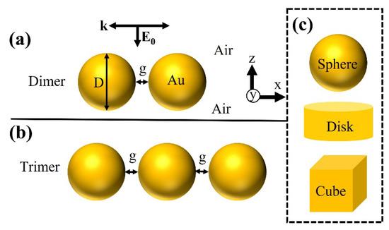 Schematic illustration of free-space (a) dimer and (b) trimer NPs separated by gap size “g” and diameter “D”. Plane-wave source illuminate plasmonic nanostructures in the normal direction with an incident electric field of E0. (c) NP shapes modeled in this work are sphere, disk, and cube. Detailed information on modeling conditions is described in Supplementary Materials or SM Figure S1.