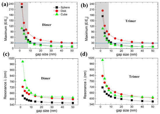 Maximum near-field strength |E/E0| obtained from dimer (a) and trimer (b) plasmonic nanostructures for different NP shapes (sphere, disk, and cube) from its respective resonance wavelength positions (c) and (d), respectively. These data are extracted from simulated broadband |E/E0| spectra as seen from SM Figures S2 and S3. Grey color region within blue dotted lines indicates our region of interest on the basis of gap mode enhancement.