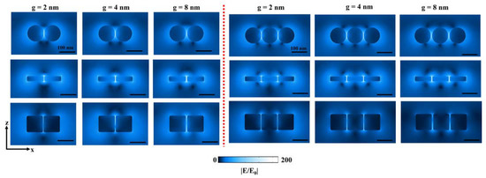 Cross-section XZ electric field profiles taken at g = 2 nm, 4 nm, and 8 nm for a dimer (left) and trimer (right) nanostructures studied in this work. Better near-field enhancement can be observed from sphere- and disk-based nanostructures when compared to a cube. Electric field profiles are scaled to the same color strength for a fair comparison. All scale bars measure 100 nm.