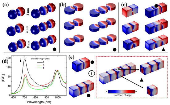 Furthermore, |E/E0| properties at shorter wavelength positions (dimer = 699 nm and trimer = 707 nm, marked as “i” in Figure 4d) were not considered a dominant or primary gap mode position for cubical NPs. When “g” is increased, resonance wavelength shift should generally follow from longer to shorter wavelength positions in terms of gap mode, especially concerning smaller “g” variations. When gap size varied from 2 nm to 8 nm, |E/E0| resonance wavelength shift from 988 nm (1000 nm) to 690 nm (687 nm) makes sense in dimer (trimer) nanostructures rather than the position marked as “i” in Figure 4d. Adding to the above complexity, changes from dipole to quadrupole mode were noted with an increased number of cubes until five (dipole mode disappeared when there were five NPs, Figure 4e). Therefore, what can be an issue with cube-based nanostructures in displaying comparatively lower near-field strength? How do disk and sphere NPs perform better at smaller gap sizes (2 nm to 8 nm)? The optical background behind this phenomenon should be studied.