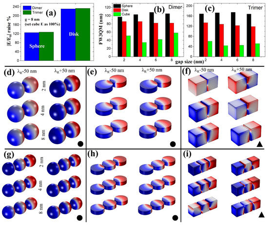 (a) Calculated |E/E0| raise% for sphere- and disk-based dimer and trimer NPs at g = 8 nm compared to a cube. (b) FW3QM results of dimers (b) and trimers (c) for different gap sizes ranging from 2 nm to 8 nm reveals sphere-based NPs can perform better. The 3DSCM profiles indicating plasmonic mode characteristics of a sphere, disk, and cube NPs taken at λR ± 50 nm wavelength positions for dimer (d–f) and trimer (g–i) nanostructures. Here λR represents resonance wavelength position as seen from Figure 1c,d. All 3DSCM profiles are arranged to follow gap sizes of 2 nm, 4 nm, and 8 nm. Solid circle (dipole) and triangle (quadrupole) symbols represent the plasmonic modes. In 3DSCM profiles, blue represents negative charge and red denotes positive charge.