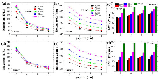 We further studied size-dependent (NP diameter “D”) plasmonic properties for a sphere-based dimer (Figure 6a–c) and trimer (Figure 6d–f) nanostructures. Figure 6 reveals the plasmonic properties of sphere-based nanostructures for different NP “D” ranging from 60 nm to 100 nm. Gap sizes within a range of 2 nm to 8 nm were considered in these simulations following Figure 1, where we can still observe gap mode-based near-field enhancement. By increasing NP “D”, we can observe resonance wavelength positions moving towards longer wavelength regions: from 577 nm to 635 nm (dimer, Figure 6a) and from 603 nm to 717 nm (trimer, Figure 6d) for a gap size of 2 nm (as an example). In the case of |E/E0|, dimer nanostructures reveal a steady rise in near-field enhancement properties until D = 90 nm and gradually become constant after that (Figure 6b). In the case of trimer nanostructures, rather than a steady increase in |E/E0|, we can see constant and ~ consistent near-field enhancement characteristics (Figure 6e). Maximum broad-spectral ranges of 105 nm (dimer) and 175 nm (trimer) are possible considering FW3QM calculations (Figure 6c,f). Considering these results, we believe that dimer- or trimer-based designs can guide us to approximately design or evaluate self-assembled plasmonic nanoclusters.