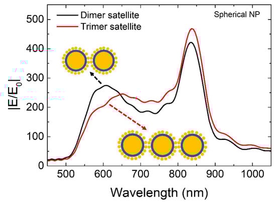 We extended our simulation studies to a simple core-shell satellite structure model (Figure 7). Bigger NP with D of 100 nm surrounded by smaller NP with D of 10 nm is modeled. A thin dielectric coating (n = 1.45) over bigger NP with a thickness of 2 nm is considered (blue colored layer as shown in Figure 7). We observed ~two-fold times increase in near-field enhancement compared to bare dimer/trimer nanostructures, which we believe is highly beneficial for various applications. At the same time, it is also possible to study and understand various super- and sub-radiant modes from these satellite structures [1,26,27,28,29].