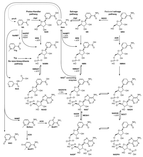 - Fessel, J.P.; Oldham, W.M. Pyridine Dinucleotides from Molecules to Man. Antioxid. Redox Signal. 2018, 28, 180–212. [Google Scholar] [CrossRef]