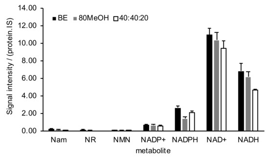 Comparison of 3 sample preparation procedures in detecting the NAD+ metabolome of Hep G2 cells: biphasic extraction (BE), 80% cold methanol (80MeOH) and 40:40:20 with 0.1 M formic acid (40:40:20) extraction (n = 5, average ±SD). Values expressed in ratios of LC-MS/MS signal intensity normalized to internal standard and total protein content (arbitrary units). Nam: nicotinamide; NR: nicotinamide riboside; NMN: nicotinamide mononucleotide; NADP+: nicotinamide adenine dinucleotide monophosphate; NADPH: nicotinamide adenine dinucleotide monophosphate, reduced form; NAD+: nicotinamide adenine dinucleotide; NADH: nicotinamide adenine dinucleotide, reduced form.