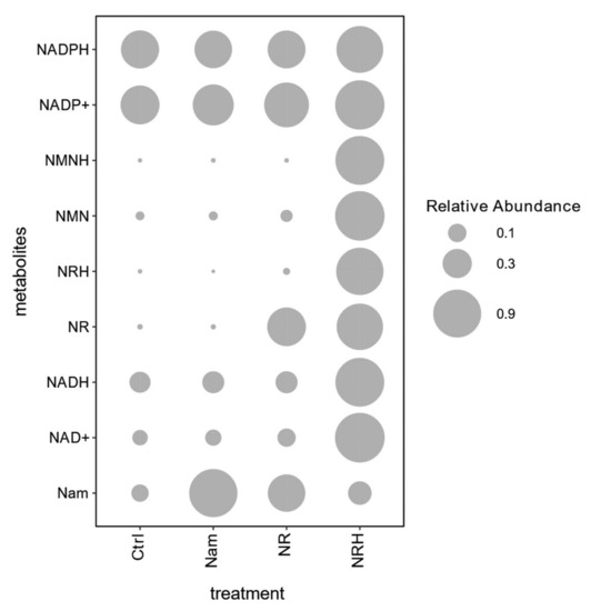 NAD+ metabolome of Hep G2 cells after addition of Nam, NR or NRH (0.5 mM) to the culture media and control (Ctrl). Measurements (n = 4) were normalized to the highest value expressed as relative abundance (log2 fold changes of average ratios of LC-MS/MS signal intensity normalized to internal standard and total protein content, in relation to control). NADPH: nicotinamide adenine dinucleotide monophosphate, reduced form; NADP+: nicotinamide adenine dinucleotide monophosphate; NMNH: nicotinamide mononucleotide, reduced form; NMN: nicotinamide mononucleotide; NRH: nicotinamide riboside, reduced form; NR: nicotinamide riboside; NADH: nicotinamide adenine dinucleotide, reduced form; NAD+: nicotinamide adenine dinucleotide; Nam: nicotinamide.