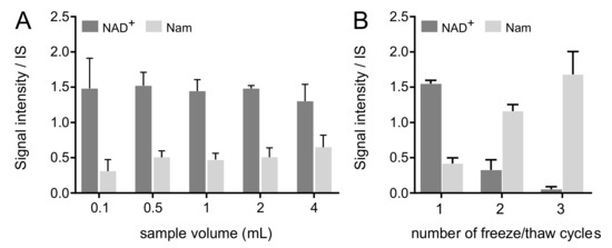 LC-MS/MS metabolite signal intensity per internal standard for NAD+ and Nam of human whole blood according to: (A), aliquot volume (0.1, 0.5, 1, 2, 4 mL) at blood draw. Average ± SD values from 3 donors (per aliquot and subject n = 1 for 0.1, 0.5 and 2 mL, n = 2 for 4 mL, and n = 3 for 1 mL); (B), number of freeze–thaw cycles (taken on 1, 13, 21 days). Average ± SD values from 3 donors (n = 3). NAD+: nicotinamide adenine dinucleotide; Nam: nicotinamide.