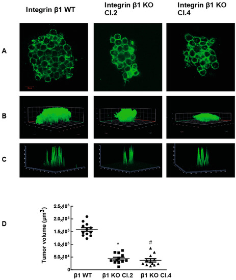 The deletion of the β1 integrin gene from MIA PaCa-2 cells decreases tumor growth on the 3D matrix. (A) Tumors formed by MIA PaCa-2 cells expressing the integrin β1 gene and cells where the integrin β1 gene removed were stained for F-Actin (phalloidin, green) to estimate the size of the tumor. Scale bar 20 µm. (B) 3D projection of z stack indicate the tumor size. (C) The projection of the intensity of actin staining (view 2.5D) and (D) Tumor volumes were measured after the acquisition of z-stack slices with confocal microscope. These images were processed using ImageJ software to determine the volume. One-way ANOVA was performed with Bonferroni’s test to compare between groups. * indicates a statistically significant difference between WT and Clone 2, n = 12, p < 0.001). # indicates the statistically significant difference between groups WT and Clone 4 n = 12, p < 0.001. Data shown are mean ± SEM, unit: µm3.