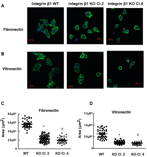 MIA PaCa-2 integrin β1 KO cells have decreased spreading ability compared to integrin β1 expressing cells. Cells were plated on either fibronectin or vitronectin coated plates for 4 h and the cells were stained with actin. (A) Actin staining of cell spread on 5 µg/mL fibronectin visualized by immunostaining (F-actin, phalloidin, green; and nucleus, DAPI, blue). Scale bar 20 µm. (B) Actin staining of cell spread on vitronectin visualized by immunostaining (Green: F-actin using phalloidin, and Blue: nucleus DAPI). Scale bar 20 µm. (C,D) Quantitative assessment of cell spreading in fibronectin (area: µm2). One-way ANOVA was performed with Bonferroni’s post-hoc test to compare between groups. * Indicates a statistically significant difference between groups (integrin β1 expressing MIA PaCa-2 and integrin β1 KO Clone 2) (n = 40, p < 0.001). # Shows a statistically significant difference between groups (integrin β1 expressing MIA PaCa-2 and integrin β1 KO Clone 4) (n = 40, p < 0.001). Data shown are mean ± SEM, unit: µm2.