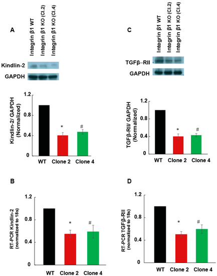 Integrin β1 deletion downregulated Kindlin-2 and TGFβ receptor 2 expression. (A) Cell lysate (30 µg/lane) from integrin β1 expressing MIA PaCa-2 and integrin β1 KO clones are immunoblotted for kindlin-2. Normalized protein expression with GAPDH shows a decrease in kindlin-2 expression in clones compared to the normal MIA PaCa-2 cells. (B) The mRNA expression quantified by RT-PCR analysis shows a significant decrease in the expression of kindlin-2 by the deletion of integrin β1. (C) Lysates were immune blotted with antibody recognizing TGFβ receptor 2. GAPDH is used as the loading control. Normalized protein expression shows downregulation of TGFβ receptor 2. (D) The mRNA expression quantified by RT-PCR analysis shows a significant decrease in the expression of TGFβ receptor 2 by the deletion of integrin β1. One-way ANOVA was performed by Bonferroni’s test to compare integrin β1 expressing MIA PaCa-2 and integrin β1 KO clones indicate a statistically significant difference n = 3, * WT and Clone 2 p < 0.001; # WT and Clone 4 p < 0.001. Quantification is expressed as mean ± SEM.