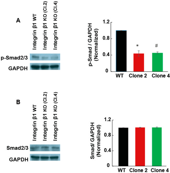 Integrin β1 deletion downregulated Smad2/3 phosphorylation. (A) Cell lysate from integrin β1 expressing MIA PaCa-2 and integrin β1 KO clones is immunoblotted for p-Smad2/3. (A) Immunoblotting of p-Smad2/3 shows inhibited downstream cell signaling pathways. Normalized P Smad-2/3 is shown using GAPDH as control. (B) Total expression of Smad-2/3 shows no significant change in the expression of Smad-2/3. One-way ANOVA performed with Bonferroni’s test to compare integrin β1 expressing MIA PaCa-2 and integrin β1 KO clones indicates a statistically significant difference n = 3, * WT and Clone 2 p < 0.001; # WT and Clone 4 p < 0.001. Quantification is expressed as mean ± SEM.