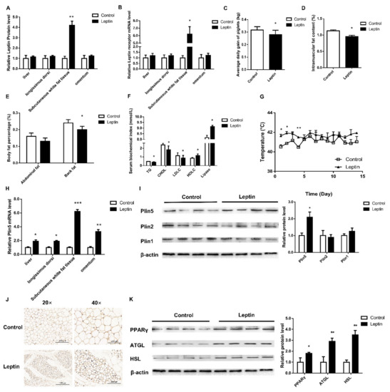 Leptin treatment for 4 weeks significantly increased the levels of leptin protein and leptin receptor mRNA in subcutaneous adipose tissue from piglets (p < 0.05, Figure 1A,B). Correspondingly, compared with the control group, the weight, back fat and intramuscular fat content of piglets in the leptin group were significantly lower (p < 0.05, Figure 1C–E). The serum triglyceride, cholesterol and low-density lipoprotein contents of piglets in the leptin group were significantly lower than those of the control group, while the high-density lipoprotein contents and lipase were significantly higher than those of the control group (p < 0.05, Figure 1F). The body temperature of piglets after leptin treatment was significantly higher than that of the control group (p < 0.05, Figure 1G). Furthermore, the mRNA and protein expression of Plin5 in the subcutaneous adipose tissue of the leptin group were significantly increased (p < 0.05, Figure 1H,I). The results of immunohistochemistry and Western Blot were consistent (Figure 1J).