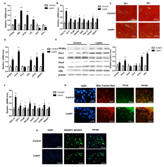 In order to verify the above results, we cultured primary porcine preadipocytes and induced their differentiation in vitro and treated the cells with 50 nmol/μL leptin for 24 h to detect the expression of related genes. The results showed that leptin treatment significantly increased the expression of Plin5 mRNA and protein in adipocytes, and further increased the expression of lipolysis-related genes (p < 0.05, Figure 2D,E). Immunofluorescence observation showed that the expression of Plin5 was more in the leptin treatment group, and Plin5 was localized around the mitochondria (Figure 2G). It was revealed by staining with BODIPY that there were fewer LD in leptin-treated adipocytes (Figure 2H). The above results indicate that leptin has the same effect in porcine adipocytes and piglet tissues.