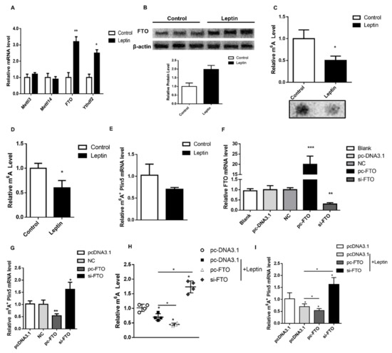 2.2. Leptin Up-Regulates FTO in Adipocytes to Inhibit m6A Methylation of Plin5