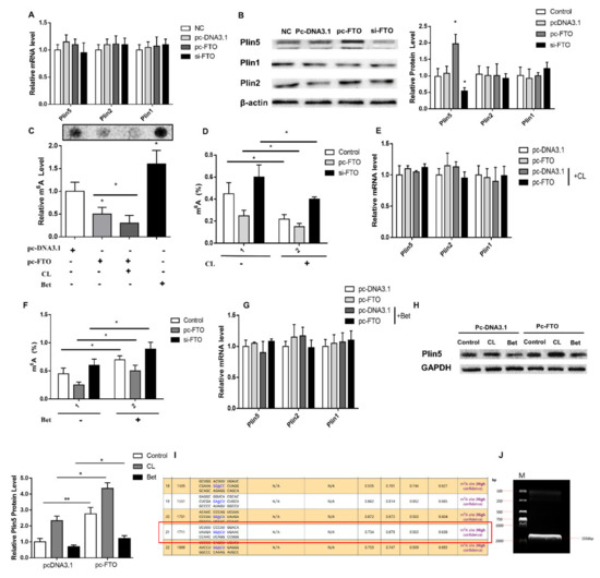 Our results show that the decrease of m6A methylation level has no effect on Plin5 transcription, but it will lead to enhanced translation and increase the expression of Plin5 protein. In order to exclude the possible influence of FTO itself on the expression of Plin5, we used CL and Bet to treat the cells. CL is a small molecule inhibitor of methylation, which can effectively reduce the level of m6A methylation [36]; while Bet is the methyl donor of m6A methylation in the body [37], which can significantly increase the level of methylation in the body. The results showed that it was consistent with the FTO vector treatment. CL significantly reduced the m6A methylation level of Plin5 and increased the protein expression of Pelin5; the Bet treatment was the opposite of CL. After further mutation of the Plin5 methylation site, overexpression of FTO did not change the m6A methylation level of Plin5, and its protein level did not increase. Previous studies have found that decreased m6A methylation will increase protein levels [38,39]. Our experiments confirmed that the up-regulation of Plin5 protein expression is caused by FTO demethylation. However, there are reports that obesity-associated SNPs are not functionally related to FTO, but are related to FTO neighboring genes IRX 3 and RPGRIP1L [40]. Although the interference of FTO affects body weight and composition [10,11], FTO intron variants and their activity are still elusive. IRX 3 and RPGRIP1L have not been reported to regulate methylation. Our results prove that M6A methylation of Plin5 is related to FTO, and whether there are other intron variants is a new direction worthy of our further exploration.