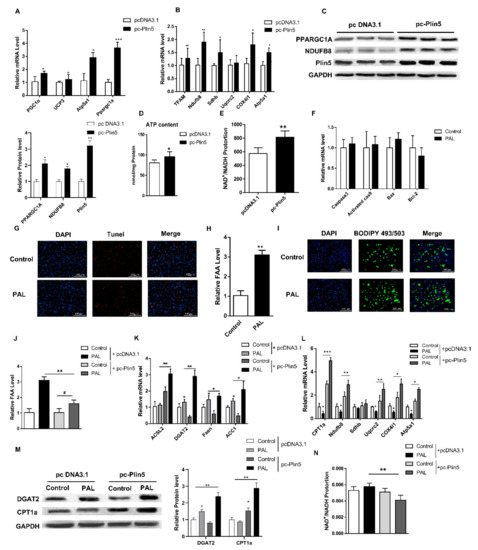 In order to study the role of Plin5 in fatty acid disorders, we used palmitic acid (PAL) to construct a fatty acid lipotoxicity model. PAL treatment in vitro had no effect on the mRNA levels of apoptosis genes such as Casp3, Casp9, Bax, and Bcl-2 (p > 0.05, Figure 6F). Similarly, Tunel staining showed that there was no significant increase in the number of apoptotic cells after PAL treatment (p > 0.05, Figure 6G). It indicated that PAL treatment did not cause apoptosis of porcine adipocytes but caused a very significant increase in cellular FFA levels (p < 0.01, Figure 6H). BODIPY fluorescent staining shows accumulation of LD (Figure 6I). These data indicate that our lipotoxicity model was successfully constructed. Furthermore, we used the Plin5 overexpression vector to transfect cells under this model and found that FFA and NAD+/NADH were significantly reduced (p < 0.05, Figure 6J, n). Interestingly, the overexpression of Plin5 under PAL treatment further increased the expression of β-oxidation rate-limiting enzyme ACSL2 and triglyceride synthase DGAT2, Fasn, and ACC1 (p < 0.05, Figure 6K). Mitochondrial complex-related genes are also significantly up-regulated (p < 0.05, Figure 6L). Further, the relative protein expression level was consistent with gene expression (Figure 6M). Our results indicate that Plin5 can alleviate the metabolic disorder caused by excessive FFA in the body. Under the lipotoxicity model, Plin5 can promote lipid anabolism and enhance mitochondrial β-oxidation.
