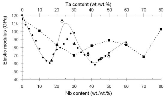 Variation of elastic modulus of Ti-based alloys with their Nb and Ta contents. ●—Ti-Nb []; ▲—Ti-Nb []; ◊—Ti-Nb []; ■—Ti-Ta [].