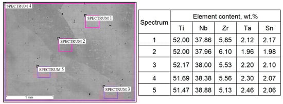The EDX results (Figure 2) show that the chemical composition of the as-cast TNZTS alloy, rounded to 0.1 wt./wt.%, is as follows: Ti-38.4Nb-5.6Zr–2.3Ta-2.1Sn. In the as-cast alloy, liquation from one β-grain to another was observed in the range of 1% for Nb, 0.5% for Zr and Ta, and 0.2% for Sn (spectra 2–5, Figure 2). Hence, the as-cast TNZTS alloy is characterized as having a large-grained structure of non-homogenous β-solid solution.