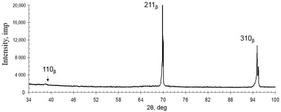 The diffraction pattern of the as-cast TNZTS alloy showed non-typical intensity or even the absence of specific peaks of the β-solid solution, which were reported previously []. We attribute this to the coarse grain structure of the alloy. It is to be noted that the diffraction pattern was taken from a limited number of β-grains, which, being at a scattering position according to Wulff–Bragg’s condition, may lack certain planes of a β-solid solution.