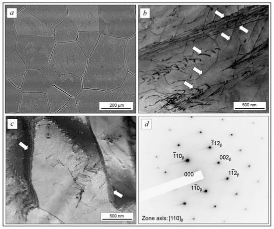 The microstructure of forged TNZTS alloy rod: polyhedral β-grains (a); dislocation structure, dislocations are indicated by arrows (b); and sub-grains structure (c) electron diffraction pattern from the β-matrix (d). Images were obtained in the transverse cross-section of the rod. Scale bar = 200 μm (a), 500 nm (b,c).
