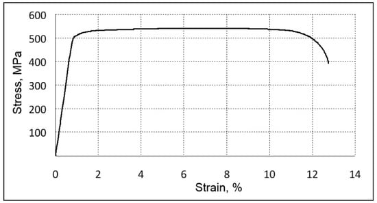 The stress–strain curve of hot forged TNZTS alloy demonstrated the near-absence of a work-hardening effect (Figure 6). Such phenomenon was also observed while conducting a tensile test of the other β-phase, Ti-based biocompatible alloys []. This is linked to a so-called dislocation-free plastic deformation mechanism and the formation of the nanometer-scale strain domains during cold deformation. The mechanical and elasticity properties of the TNZTS alloy, recorded with the help of a tensile test (Table 2), are typical for Ti-Nb-system-biocompatible alloys with a metastable β-structure [].