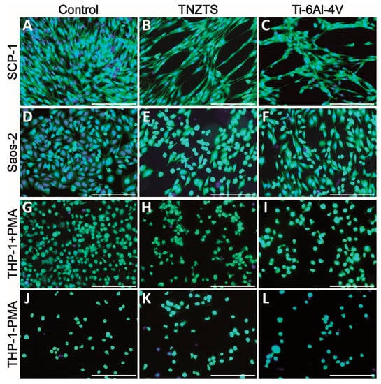 Cell viability on cell culture plate plastic (control, (A,D,G,J)) and tested metallic scaffolds (TNZTS, (B,E,H,K); Ti-6Al-4V, (C,F,I,L)). SCP-1, Saos-2, and THP-1 (with and without PMA) were cultured on analyzed substrates for 24 h. Viable cells exposed to Calcein-AM exhibited green fluorescence. Nuclei (blue fluorescence) were labeled with Hoechst 33342 counterstain. Sb: 200 µm.