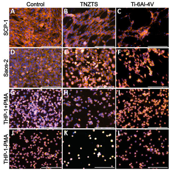 Cell adhesion on cell culture plate plastic (control, (A,D,G,J)) and tested metallic scaffolds (TNZTS, (B,E,H,K); Ti-6Al-4V, (C,F,I,L)). SCP-1, Saos-2, and THP-1 (with and without PMA) were cultured on analyzed substrates for 24 h. Cell actin and nuclei were stained by Alexa Fluor 555 Phalloidin (orange) and Hoechst 33342 (blue), respectively. Sb: 200 µm.