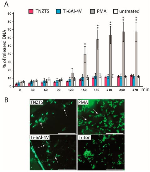 (A). Sytox Green Assay to determine NETosis rate in the presence of metallic scaffolds. Fluorescence signal was detected every 30 min up to 4.5 h. Fluorescence signals were recorded for untreated neutrophils and neutrophils cultured with TNZTS, Ti, and PMA (positive control). The data are presented as % of DNA released with Triton-treated, 100% lysed neutrophils. Data represent mean ± SD, n = 3. Asterisks show level of statistical significance (p) for untreated cells and cells incubated on metallic scaffolds (TNZTS alloy and Ti-6Al-4V) versus PMA-induced neutrophils: * for p < 0.1; ** for p < 0.05. (B). Microscopic visualization of neutrophil extracellular traps. NETs released by neutrophils (marked by arrows) were visualized after 150 min incubation onto TNZTS or Ti and subsequent stimulation with PMA (100 nM). Then, cell necrosis was induced by 0.5% Triton X-100. Sb: 400 µm. The images shown are a representative dataset of four independent experiments.
