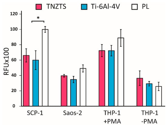 Summary of the results of resazurin reduction in cell cultures: SCP-1, Saos-2, THP-1 (with and without PMA) at 24 h after seeding indicating mitochondrial activity. Tested cells were cultured on metallic scaffolds (TNZTS alloy and Ti-6Al-4V) and cell culture plate plastic (PL). The measurements were taken at 150 min following incubation with resazurin; * for p < 0.1; data represent mean ± SD; n = 3.